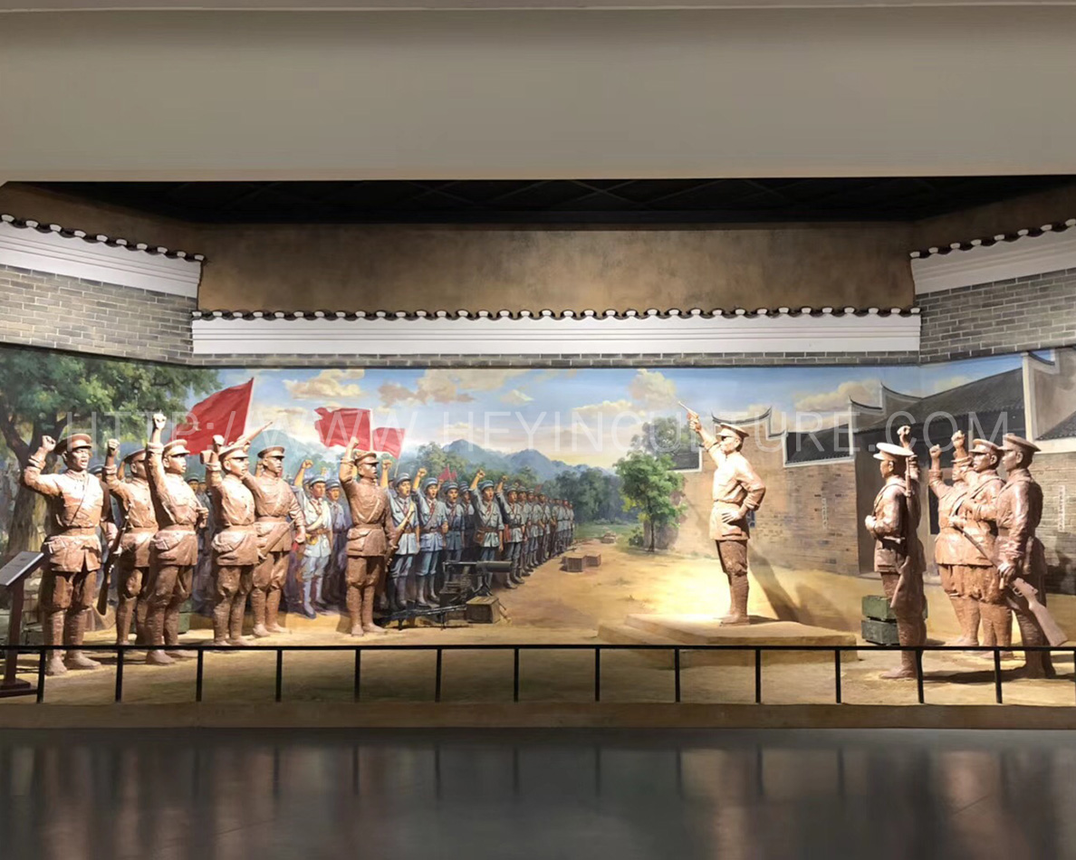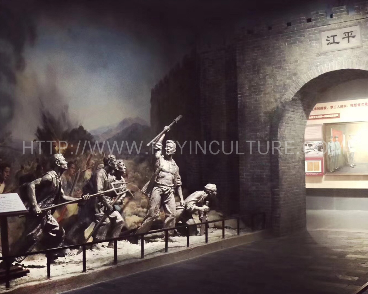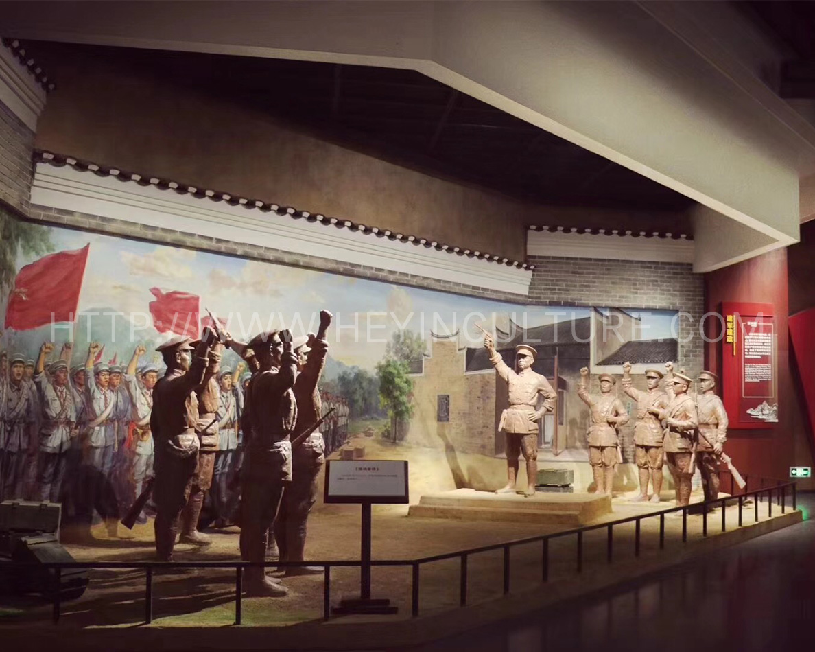 设计说明:彭德怀站在台上对着士兵发表讲话,斗志昂扬,前面是延伸式油画,士兵们扛着枪,望着彭德怀,群情激奋。旁边墙上挂展板。为营造氛围,在展墙上挂宣传语“打倒土豪劣绅”“打倒军阀”“打倒克扣军饷的周磐”等。整个场景模拟天岳书院操场。同时,在场景合适位置按照投影仪,播放平江起义时天岳操场誓师的镜头。
